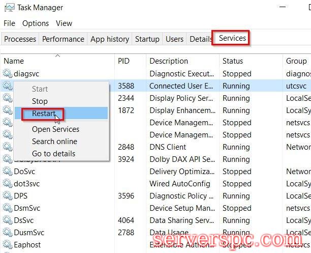如果Dropbox同步在系统上突然停止,则应检查Dropbox进程是否在系统上运行。如果没有,则应重新启动该过程,并检查上述问题是否解决。为此,请按照以下步骤操作,在任务栏上右键单击并打开thetask ManagerWindow.inside任务管理器,从列表中选择theserviceStab和位于Ropbox Services。