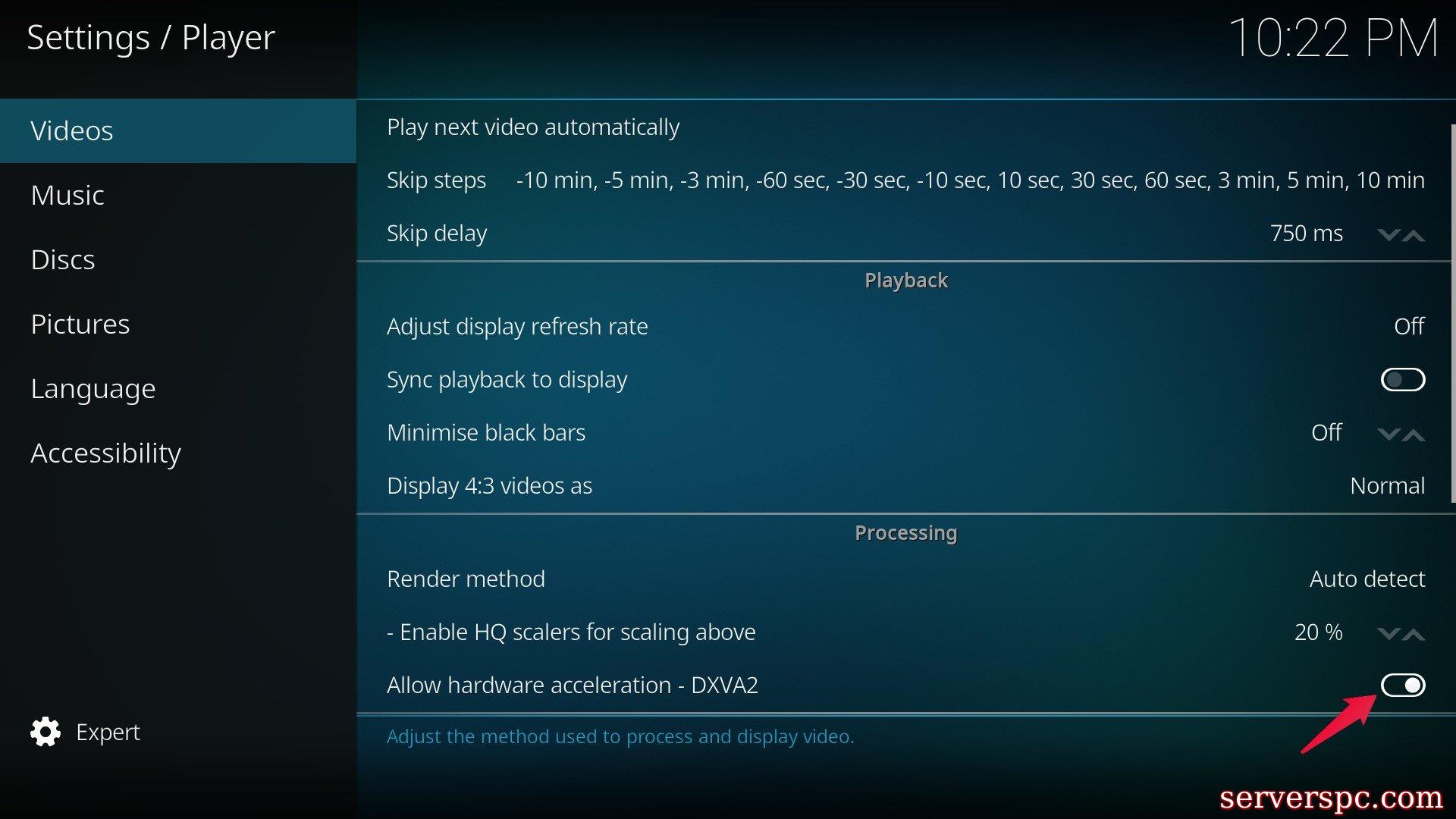 现在,在视频部分中,向下滚动并禁用通过关闭切换的硬件加速DXVA2。您已经在Kodi上禁用了硬件加速度。重新启动应用程序,并检查问题是否解决。