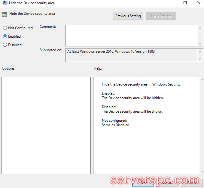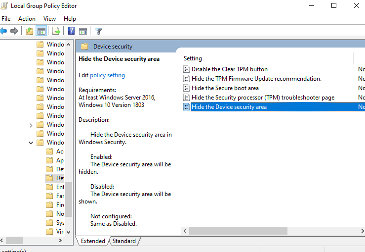 现在,您的设备安全部分肯定会被隐藏。如果您希望此设置再次出现,请返回组策略编辑器中的相同路径,然后将切换从启用到未配置或禁用。您将再次在Windows安全窗口中显示设备安全设置。