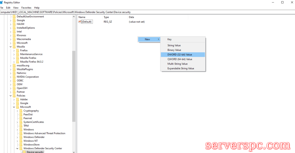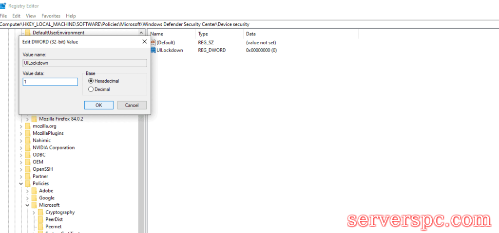 按Windows键 + r,它将打开“运行对话框”。在“运行”对话框中的Enter regedit,然后单击OK。UAC(用户帐户控制)弹出窗口将出现,索取许可以访问注册表编辑器。单击“是”。在注册表编辑器窗口中,导航到路径:HKEY_LOCAL_MACHINE \ SOFTWARE \ policies \ Microsoft \ Microsoft \ Windows \ Windows Defender Security Center \ Device Security。如果注册表中缺少任何键,请通过右键单击并在先前可用的键中选择新密钥选项来创建它们。在设备安全密钥中,右键单击右键,然后选择新的DWORT(32位) )值选项。名称此新创建的值为UilockDown.Right-click此新创建的值并选择modify.change值数据为1。
