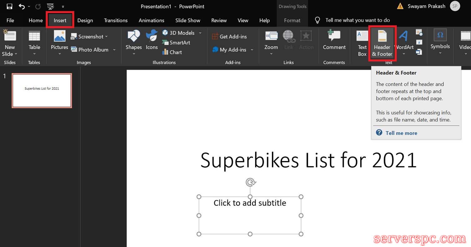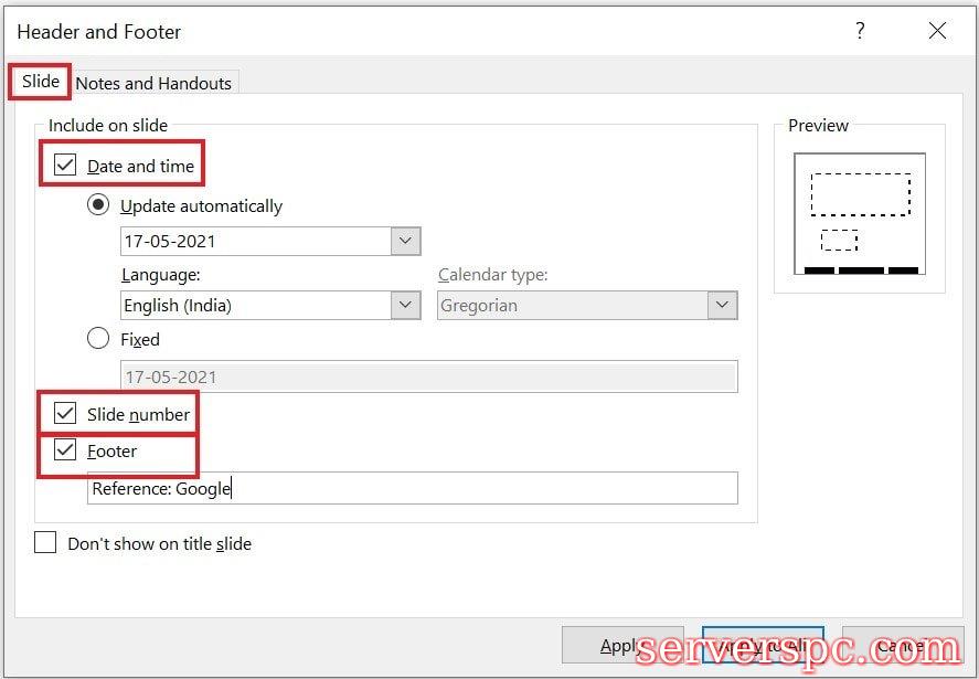 要包含滑块编号,请单击“复选框”幻灯片,要在PowerPoint幻灯片中添加页脚,请单击“复选框”脚部,您必须添加一些文本,这些文本将在“页脚”部分中显示,如果您选择所有信息,请与所有人相同的信息,与日期/时间相同的信息,幻灯片编号和页脚数据将出现在PowerPoint演示文稿中的所有幻灯片上。否则,单击“应用”将使标头和页脚信息显示在当前的slide上,人们在页脚部分上放置了不同的数据,以用于PowerPoint表示的不同幻灯片。这完全取决于您希望如何为PowerPoint项目进行设置的酌处权。您可以查看上面的屏幕截图。幻灯片,日期和页脚音符的详细信息显示在页脚部分中。所有这些元素都可以根据您的要求来定制。