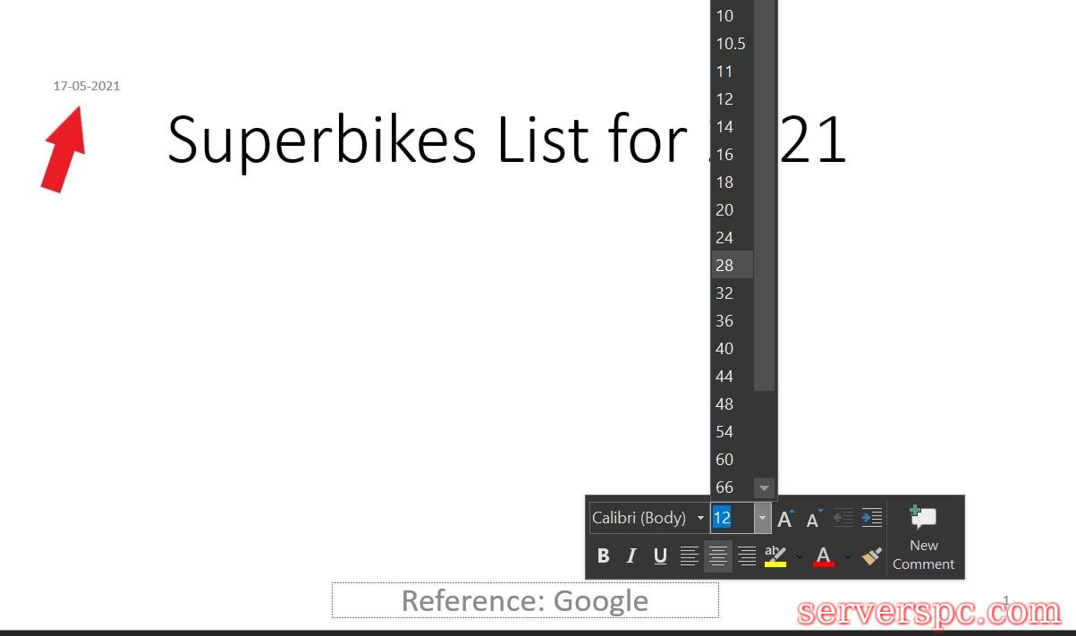 您可以同样单击以选择日期。然后对其进行各种自定义。这包括更改文本的大小,更改文本的字体或颜色。在上面的屏幕截图中,我更改了从页脚到headeralso的日期的位置,我试图在PowerPoint幻灯片中调整页脚音符的文本大小