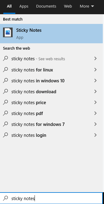 为了启动粘稠的音符,按下thewindowskey,然后键入insticky笔记。从结果开始,您会发现粘性笔记作为应用程序。单击它,将启动粘稠的音符。要快速访问,您可以在启动任务栏上的粘性音符图标上右键单击,然后选择PIN到TaskeBaroption。