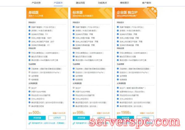 阿里云速成美站分为三个版本,价格在500元起,按年计费。作为阿里云心选自助建站产品,它拥有强大的功能后台,覆盖展示、官网电商、会员管理、支付、多语言及在线表单等通用网站应用场景,可视化操作界面,无需技术即可完成网站搭建,集成阿里云资源,阿里云全自助备案服务、域名一键解析,享受阿里云计算快速稳定安全保障,免费更新升级系统服务等。