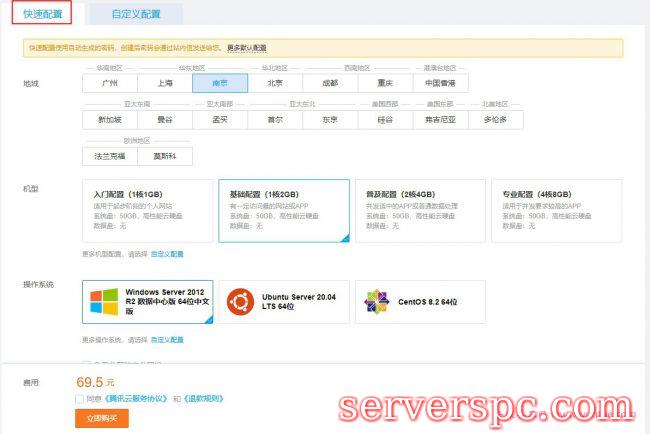 二、点击进入腾讯云服务器购买页,点“立即选购”进到配置网页页面,最上边的“快速配置”见到以下基本配置选择项。