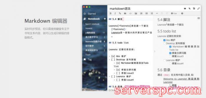 当然,如果你没有存文件的需求,只是想做做笔记,找个地方随时同步和查看,用云服务器来搭建个人云笔记也是很不错的。对于喜欢做电子笔记的同学,用markdown笔记能够提升不少效率。而刚好Leanotes就很适合: