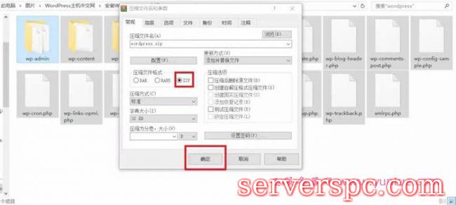 全选WordPress文件夹里面的所有文件,右键添加到压缩文件,选择ZIP格式,点击确定压缩。