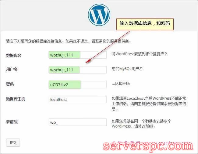 输入数据库名,用户名和密码,这些信息可以点击宝塔面板左侧导航下的数据库模块查看。下面的数据库主机和表前缀不改。
