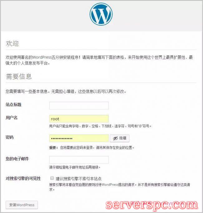 填写站点标题,设置用户名和密码,输入邮箱,不勾选“建议搜索引擎不索引本站点”,最后点击安装WordPress。