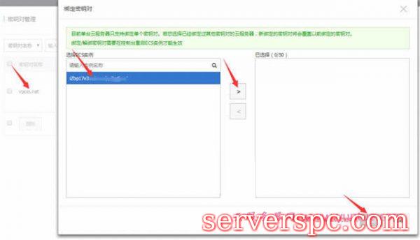 在刚创建的密钥最右侧,点击“绑定密钥对”,弹窗如下图,选择你要绑定到哪个 ECS 云服务器实例,再点击向右的箭头添加上去,确定。