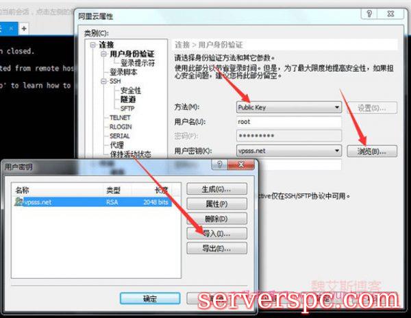 现在我们打开 SSH 软件,Xshell6.0打开 SSH 连接属性,方法改成 Public Key,用户密钥右侧点击浏览,弹窗中选择导入,把刚才下载的私钥导入进来。因为阿里云创建的私钥使用未加密的 PEM(Privacy-enhanced Electronic Mail) 编码的 PKCS#8 格式,我们不用输入密码直接点击确定,最后点击连接。
