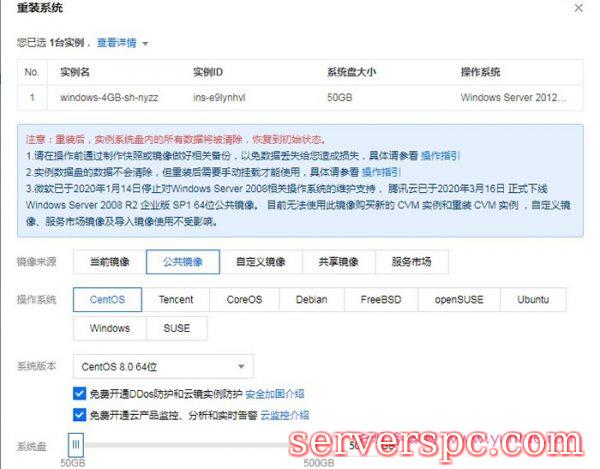 4.更换镜像接着进入系统重装镜像修改界面,我们选择公共镜像。根据您的需要来,比如把之前的 windows2012 64位 改成 CentOS 8.0 64位 然后确定。