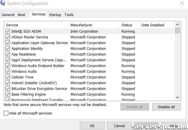 - 在“系统配置”窗口中,从垂直菜单导航到“服务”选项卡,然后在下方单击“隐藏所有 Microsoft 服务”选项之前的复选框。