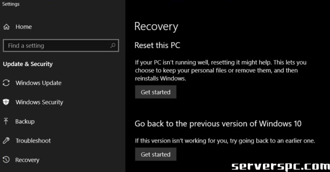 - 在右窗格菜单中,在返回到以前版本的 Windows 10部分下,单击开始使用选项卡。