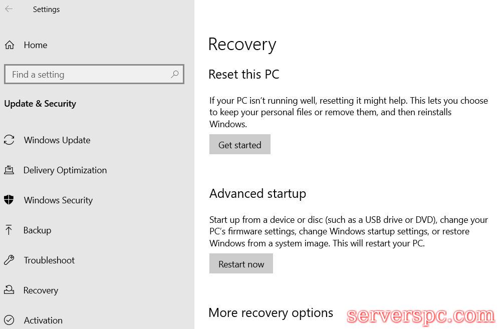 现在,在恢复窗口,在右窗格菜单上,在重置此PC选项下,单击“启动”选项卡。