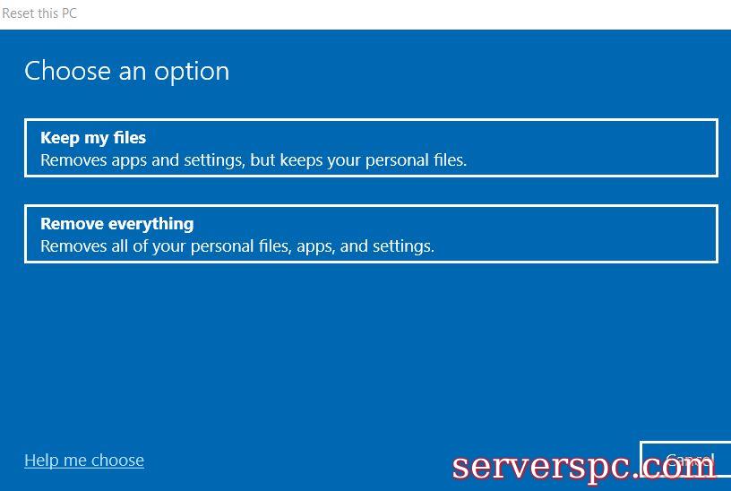接下来,在新打开的蓝屏上,您可以找到两个选项,删除所有内容并保留我的文件。根据您的选择选择一个选项。最后,单击“重置”按钮。等待过程完成,此过程可能需要额外的时间,您都完成了