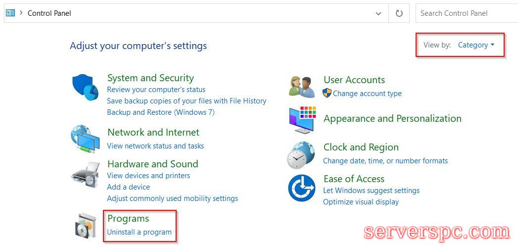 现在,在“控制面板”窗口中,选择视为类别的视图,然后选择卸载程序选项。