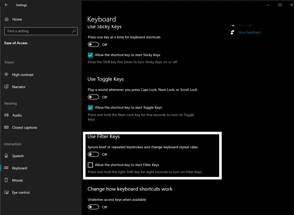 在左窗格上,单击键盘。现在,在右窗格上,查找使用过滤器键的切口。找到它后,禁用它。另外,请取消选中“允许快捷键”启动过滤器键选项的框。