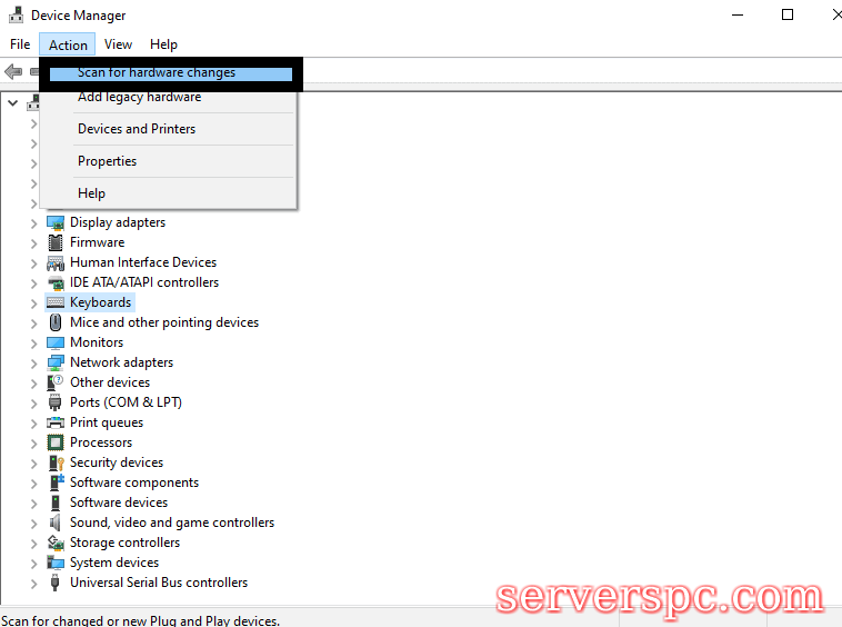现在,单击设备管理器窗口顶部的操作选项,然后选择扫描以进行硬件更改。 Windows将自己安装缺失的键盘驱动程序。