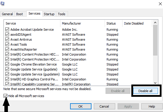 单击“服务”选项卡。检查旁边隐藏所有Microsoft服务的框,然后单击“禁用全部”。