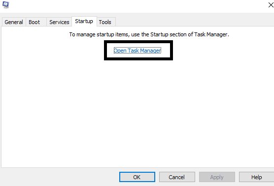 现在转到“启动”选项卡,然后单击“打开任务管理器”。