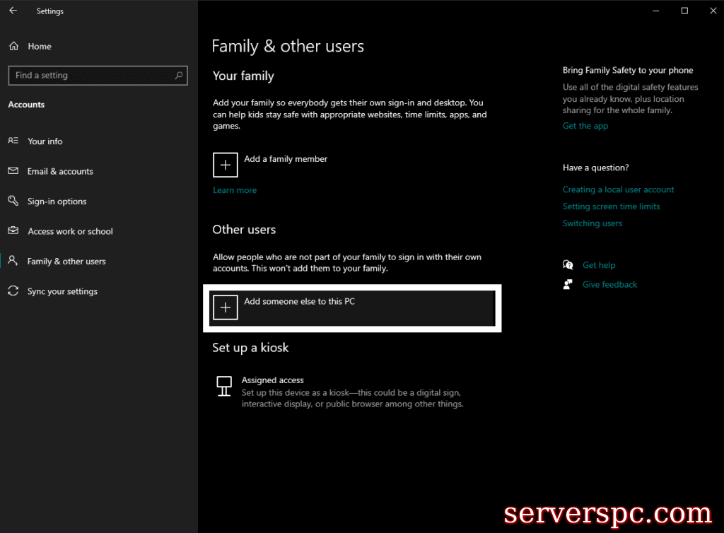 在左窗格上,单击“家人”其他用户。在右窗格中,单击其他用户部分下的PC选项中的其他人。