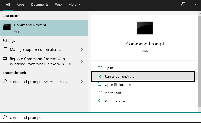 单击Windows搜索并搜索命令提示符。一旦显示在结果中,请单击“以管理员”为管理员。命令提示符窗口将打开。