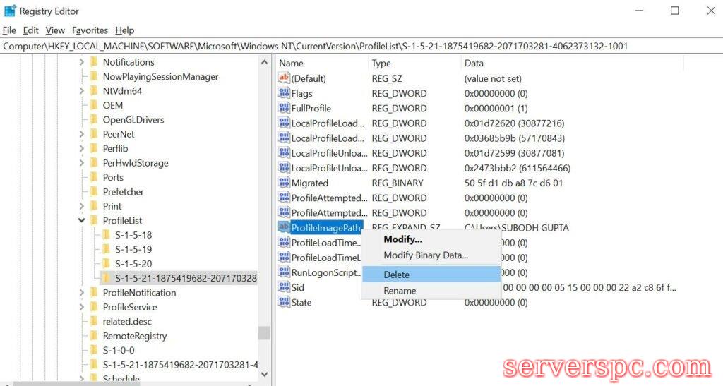 一旦您在配置文件列表中,您就可以看到几个条目。仅单独单击每个条目,然后检查profileImagePath数据。如果它与有问题的用户配置文件匹配,则在右键单击上配置文件并选择Delete.4。删除未知帐户