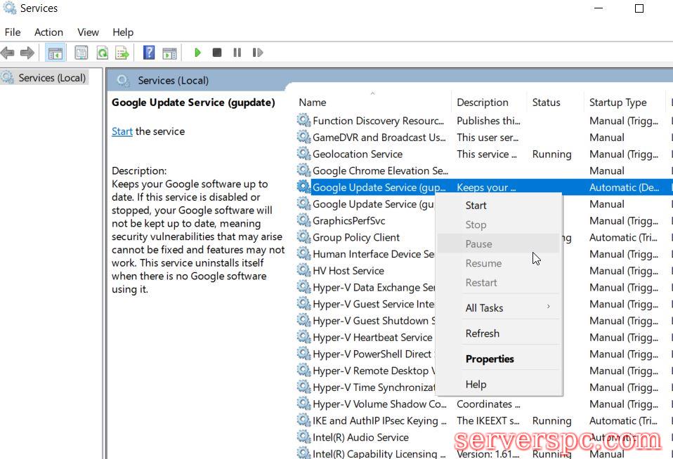 在服务窗口内,向下滚动服务列表并找到Google Update Services(gupdate)。右键单击它,然后从子菜单中选择属性。