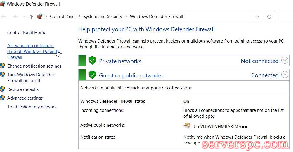 在Windows防火墙内,导航到左窗格菜单,然后单击Windows Defender Firewall允许应用程序或功能。