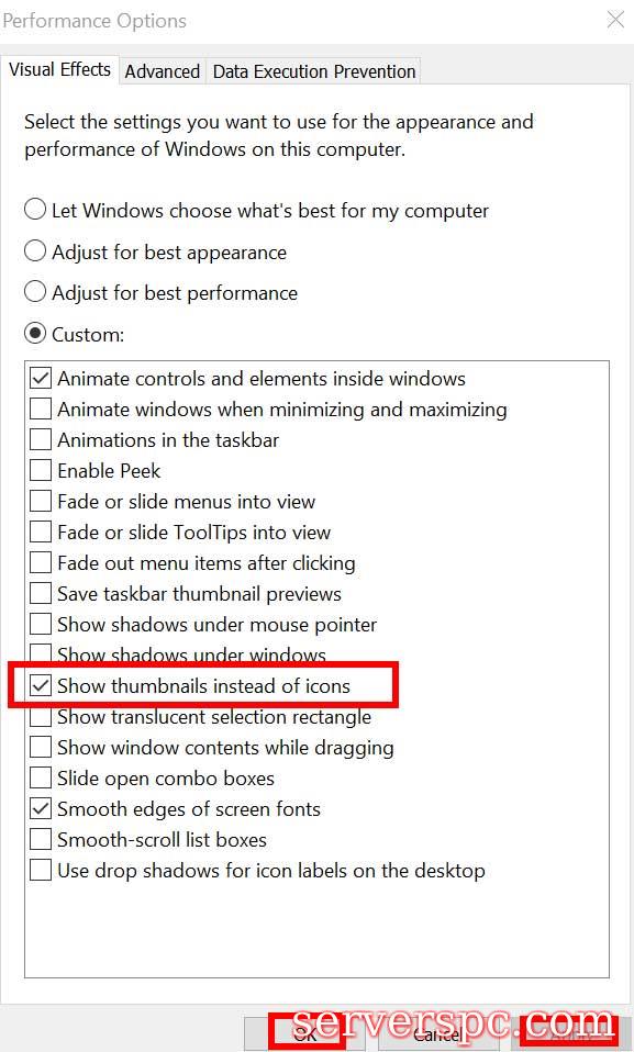 现在,单击“ performance” 选项的设置。可启用显示缩略图的复选框,而不是图标。
