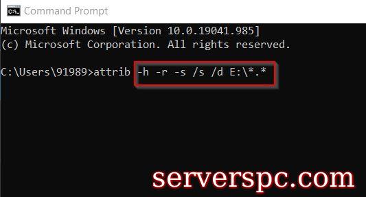 现在在命令提示符窗口中,键入或复制 +粘贴属性-h -s /s /d e:\*。*。