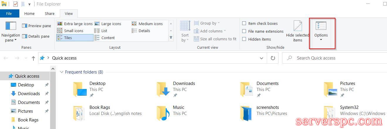 导航到“视图”选项卡(从垂直菜单),然后单击选项(在右上角)。现在,新打开的文件夹选项窗口内,单击“视图”选项卡。
