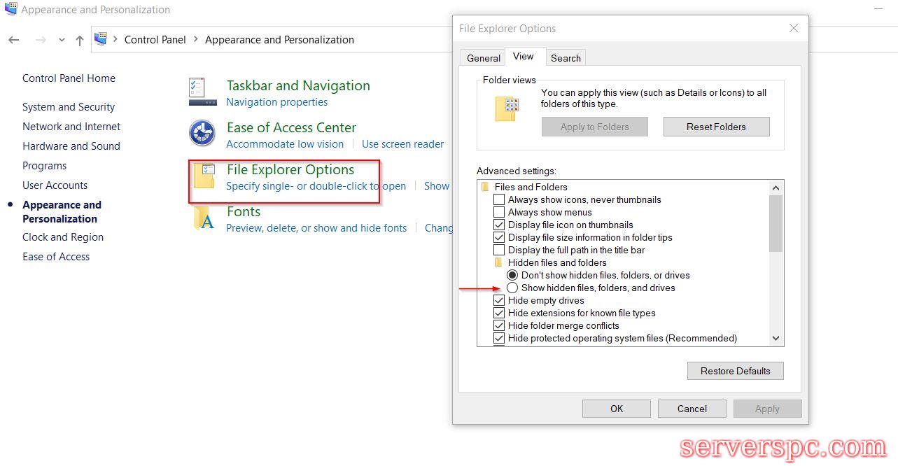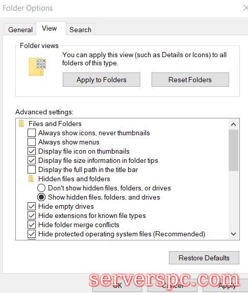 在“高级设置”部分下,勾选选项的圆形按钮显示隐藏的文件,文件夹和驱动器。单击“应用”然后确定。SOLLODE4:在Windows 10中显示带有控制面板的隐藏文件: