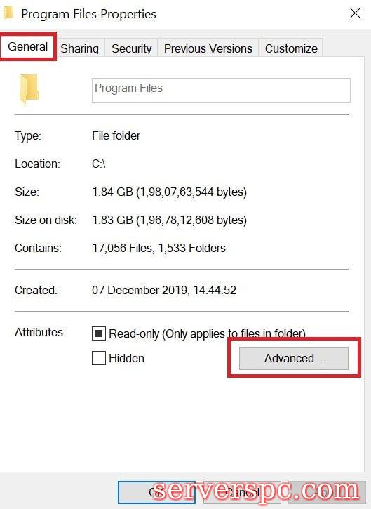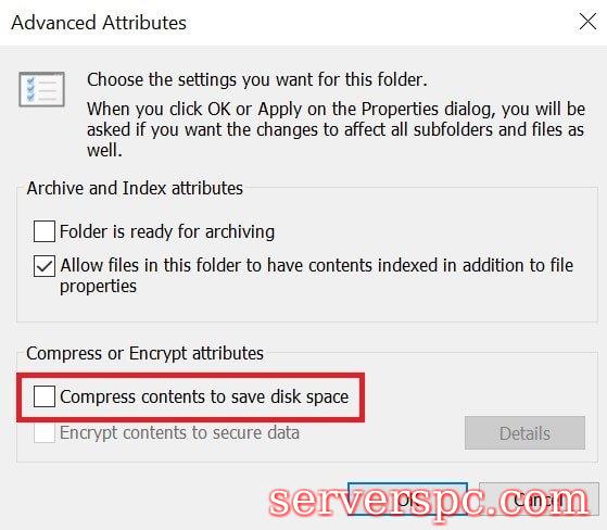 单击高级,然后转到“高级属性”导航以压缩或加密属性,以取消选中复选框压缩内容以空间保存磁盘,请单击“确定”,然后单击“应用”