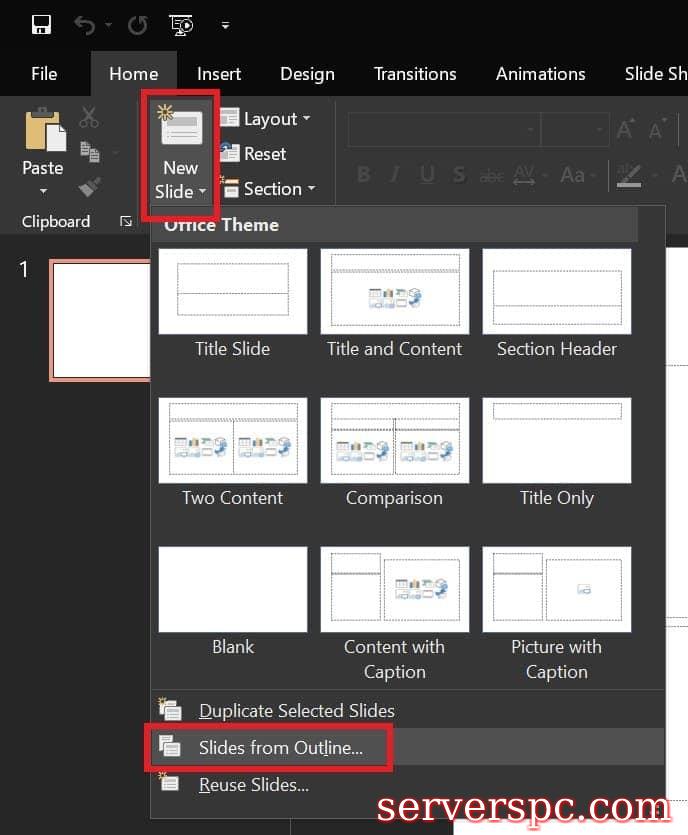 单击“主”选项卡,然后单击“大纲新的SlidessElect幻灯片”