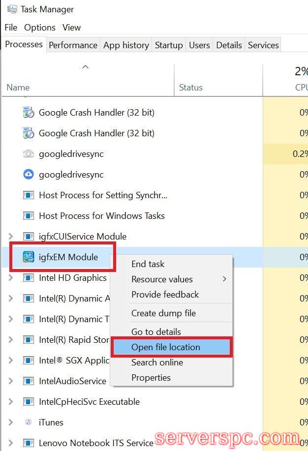 您必须使用防病毒病毒对整个系统进行快速检查。这就是为什么我一直说您必须始终启用和更新的反病毒,才能打击任何恶意软件或病毒情况。如果您的防病毒全部设置为设置,那么您将无机会面对任何恶意软件攻击,如果某些其他.EXE文件作为IGFXEM应用程序伪装,那么第一件事就是将其停止。通过击中 ctrl + alt + delete ,然后单击“进程”选项卡,导航到该可疑的IGFXEM文件右键单击,然后选择“结束任务”