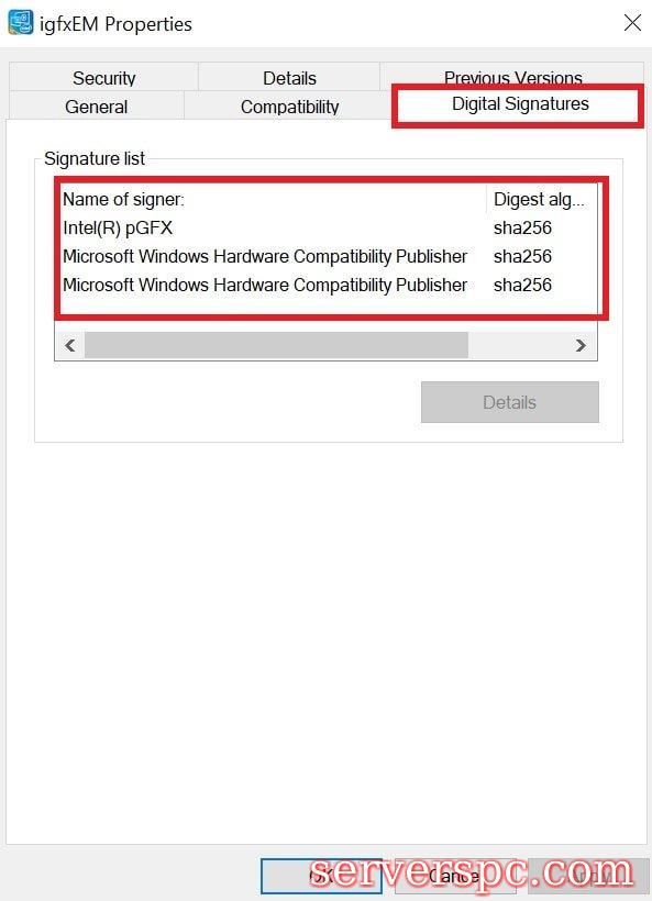 您还可以检查上述应用程序上的数字签名。该文件将在其文件夹位置now中打开,右键单击igfxem clote propertiesthen propertiesthen单击数字签名,您将看到该文件具有来自Intel和Microsoft的签名。