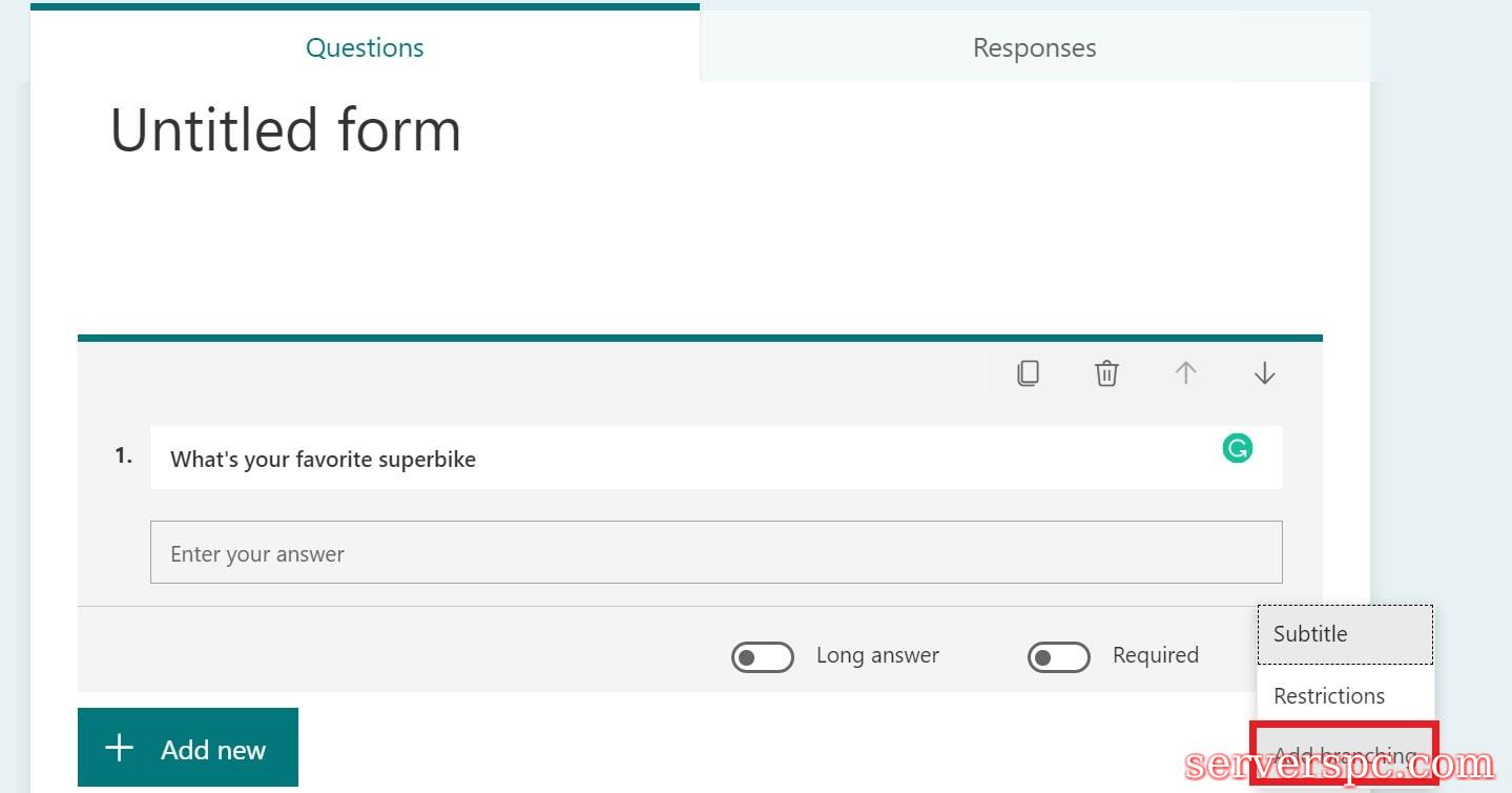 单击任何问题以突出显示它,然后单击问卷调查的右角的三点按钮选择添加分支