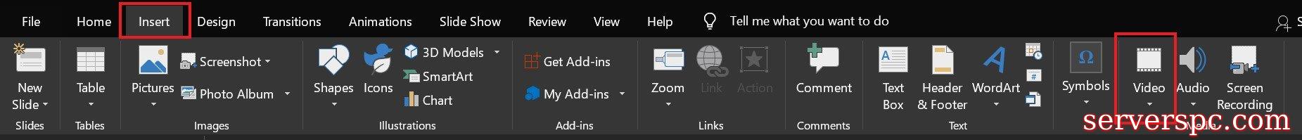 在PCGO上启动PowerPoint应用程序,以插入TABUNDER,该应用程序导航到选项视频的最右端。点击它。