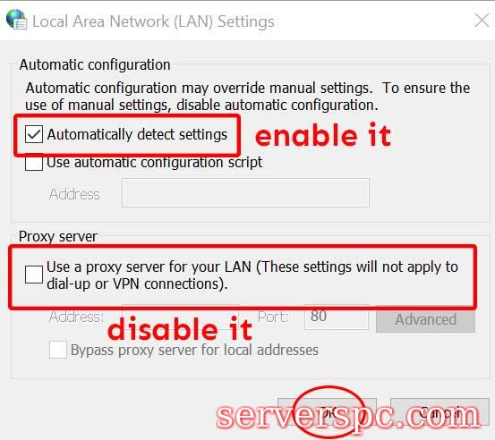 在代理服务器选项下,AdvertisementSuncheck使用代理服务器为您的LAN使用,以禁用它。单击OK并关闭窗口。预定地重新启动计算机并再次检查错误。