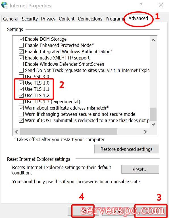 转到“高级选项卡”启用所有三个TLS协议,通过检查TLS 1.0,TLS 1.1和TLS 1.2选项的框,然后使用applaim。请单击“应用程序”,然后保存更改。请打开OneDrive App并检查符号 – 错误代码0x8004DE40是否再次发生。