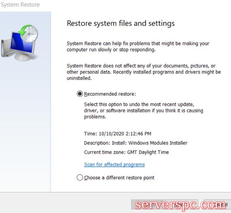 在系统还原窗口上,选择其他还原点无线电循环按钮,然后单击下一步。现在选择较早日期的还原点(一个星期或一个月)。检查效果(程序/软件/文件删除) ,撤消设置)恢复到旧日期,单击“受影响程序”选项卡的扫描。在此之后,单击下一个和完成选项卡。完成后,它将撤消任何最近的设备更改,从而触发动态平台和热框架驾驶员问题。现在检查修复程序是否适合您。