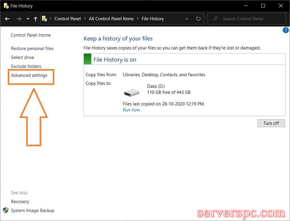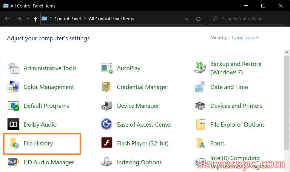 打开控制面板。选择文件历史记录选项。请注意,您必须通过选项将视图更改为大图标。