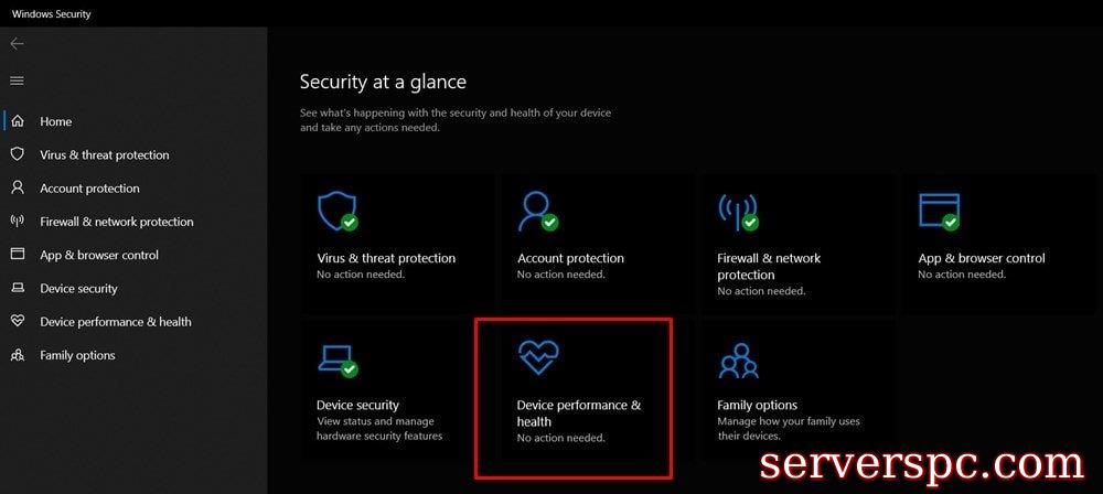 首先,从开始菜单中搜索Windows安全性。然后转到设备性能和健康部分。