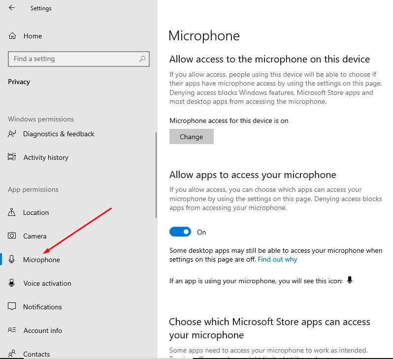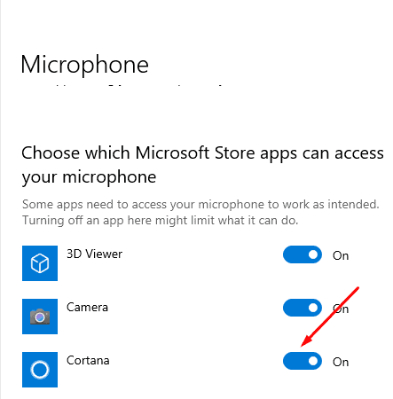 当您在麦克风部分内部时,将右窗格向下滚动到应用程序列表。从他们那里,查找科尔塔纳和查看右侧的切换开关是否已切换。如果不是这样,只需单击“切换开关”即可使Cortana访问您的麦克风,希望可以解决问题。