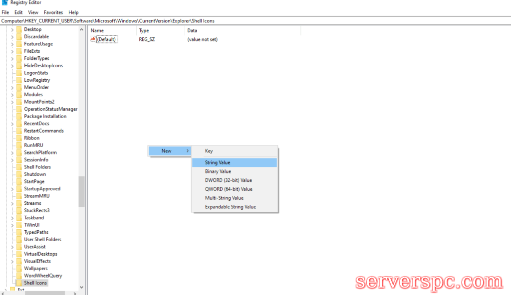 右键单击左侧的Explorer键,然后选择NewKey。将新键的名称设置为shell图标,然后按Enter.Shell图标键,右键单击右窗格的空间。选择新闻弦值,然后将新值的名称设置为29。