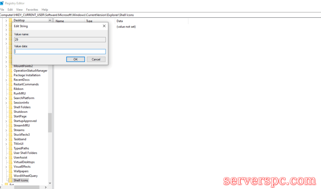 现在,在壳图标钥匙中,右键单击右窗格的空间。选择新闻弦值,然后将新值的名称设置为29.双击此新29键,然后在“值数据”字段中输入存储新下载ICO文件的位置。注册表,然后重新启动您的整个系统。重新启动后,您将看到新的快捷方式图标,其中包含所有快捷键,文件夹和程序。