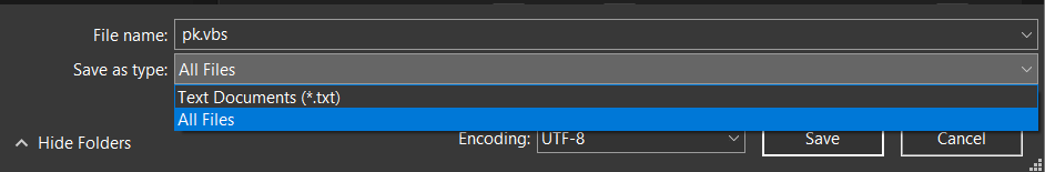 现在转到文件,然后单击另存为。您可以将此文件提供您选择的任何名称,但扩展名为.vbs。对于本指南,让我们命名PK(产品密钥的简短形式)。因此,在文件名下,输入pk.vbs并在文件类型部分下方,更改所有文件,然后命中保存。一旦保存了文件,请双击启动它,如果产品密钥将就在前面,则你的。