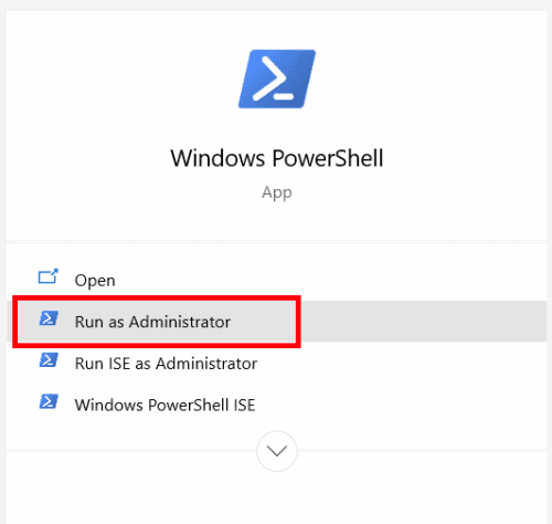 步骤1)访问theWindows搜索Barand Typepowershell。右键单击PowerShell申请表格的结果,然后选择作为管理员运行。